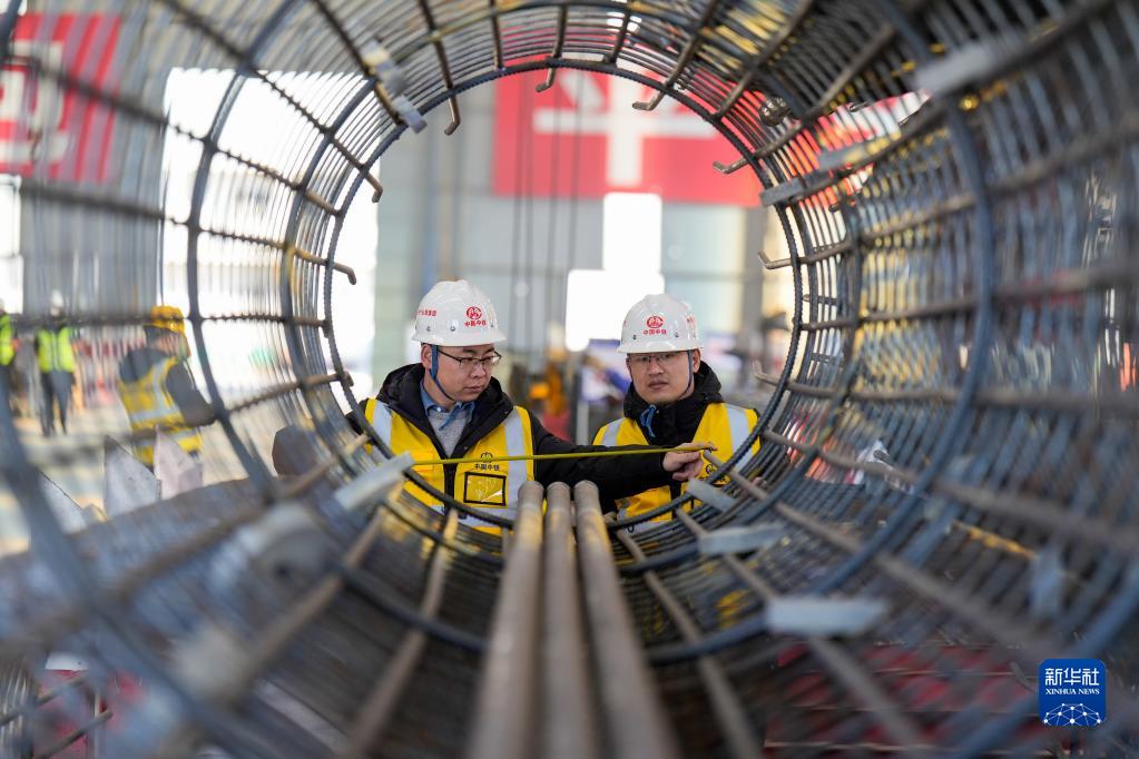 2月25日,在雄忻高鐵雄保段一標段鋼筋加工場(chǎng)內,中鐵電氣化局的施工人員檢測鋼筋質(zhì)量。