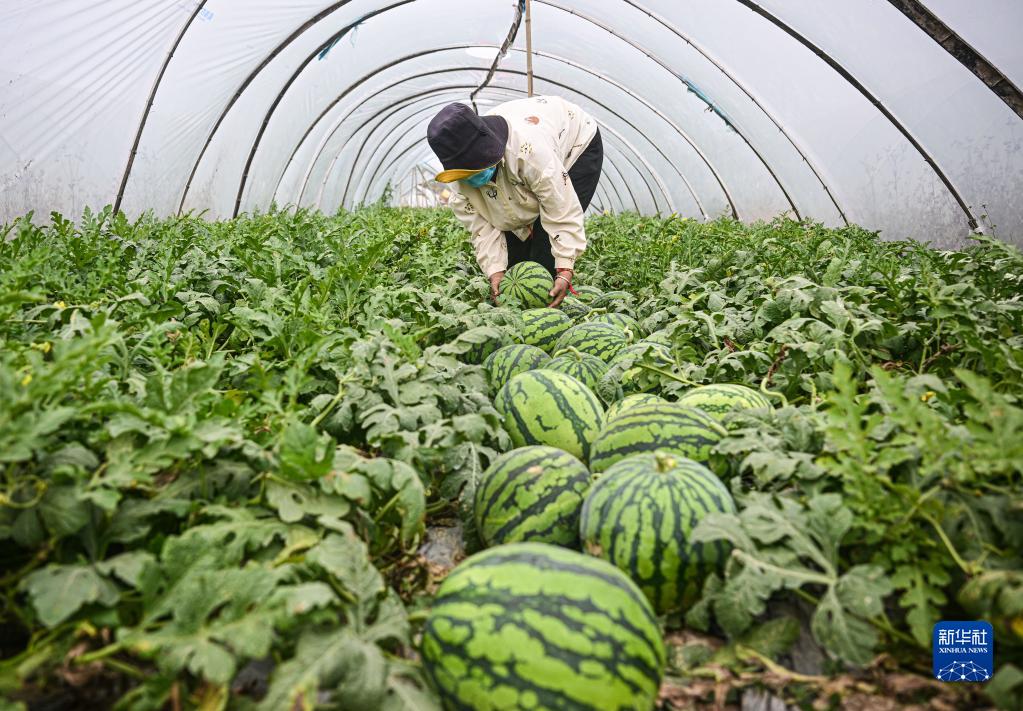 農戶(hù)在海南省儋州市中和鎮七里村采收麒麟西瓜(2月24日攝)。