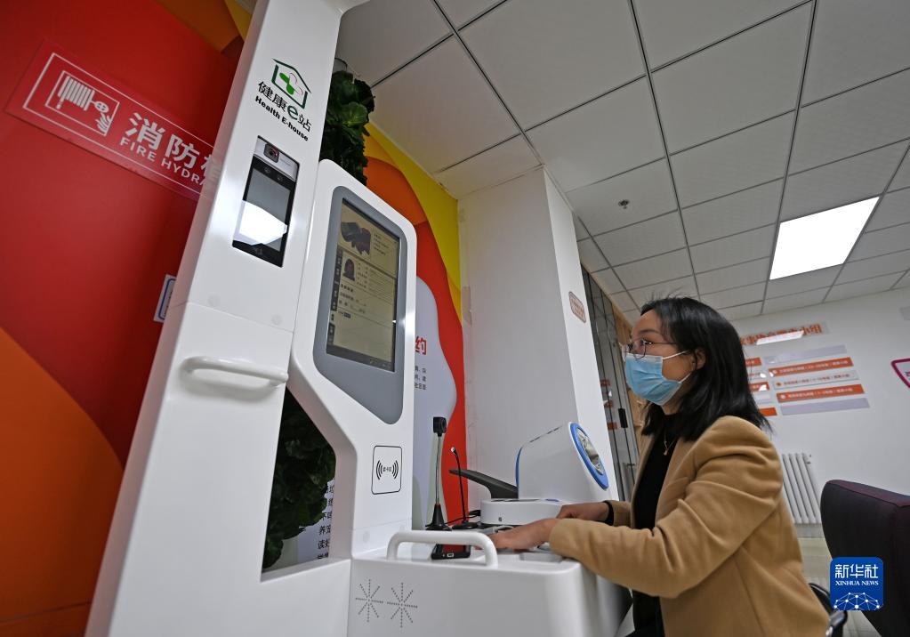 在中新天津生態(tài)城第三社區季景蘭庭小區,居民在體驗設在小區里的“健康e站”(2月24日攝)。