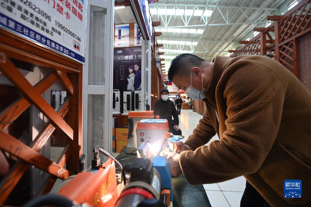 在中新天津生態(tài)城第三社區中心,一家開(kāi)鎖行經(jīng)營(yíng)者正在為顧客配鑰匙(2月24日攝)。