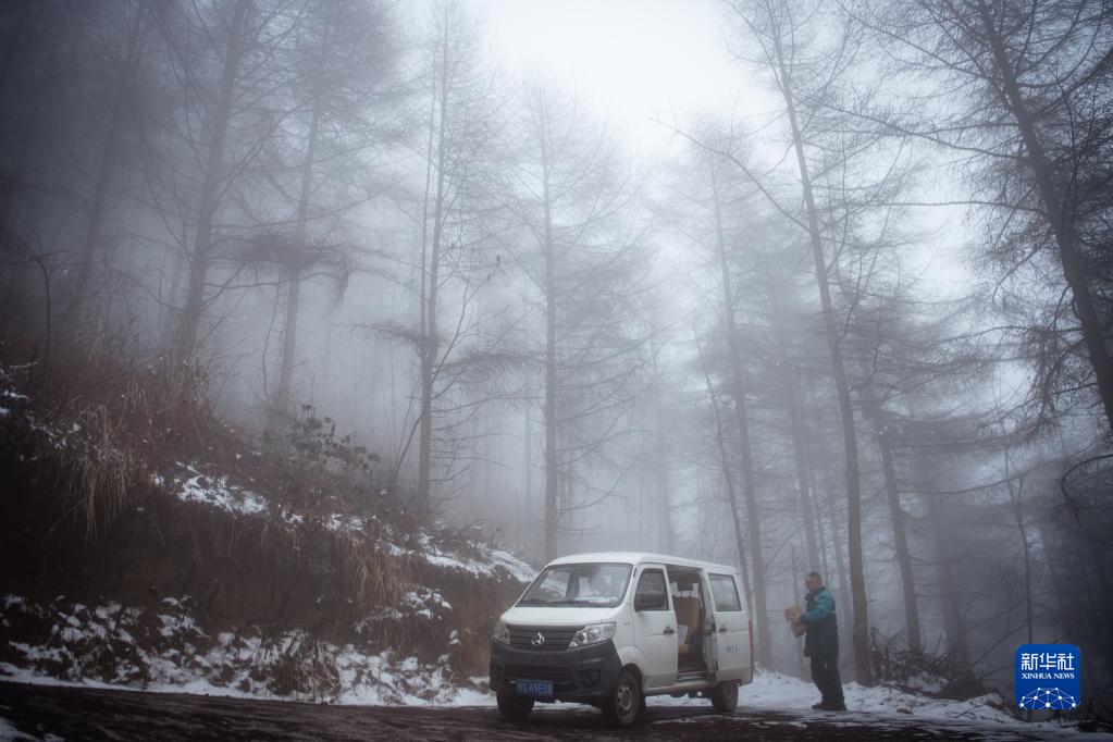 2月23日,由于道路積雪,陳祖章將郵車(chē)停在路邊,步行上山送件。