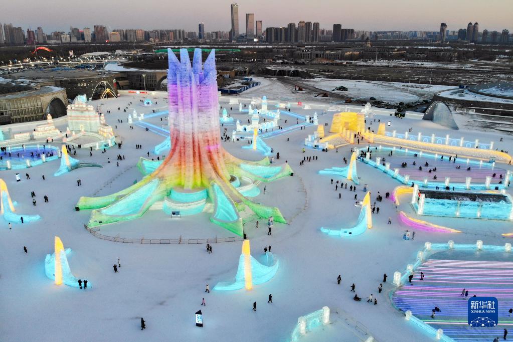 2月25日,游客在哈爾濱冰雪大世界園區游玩(無(wú)人機照片)。