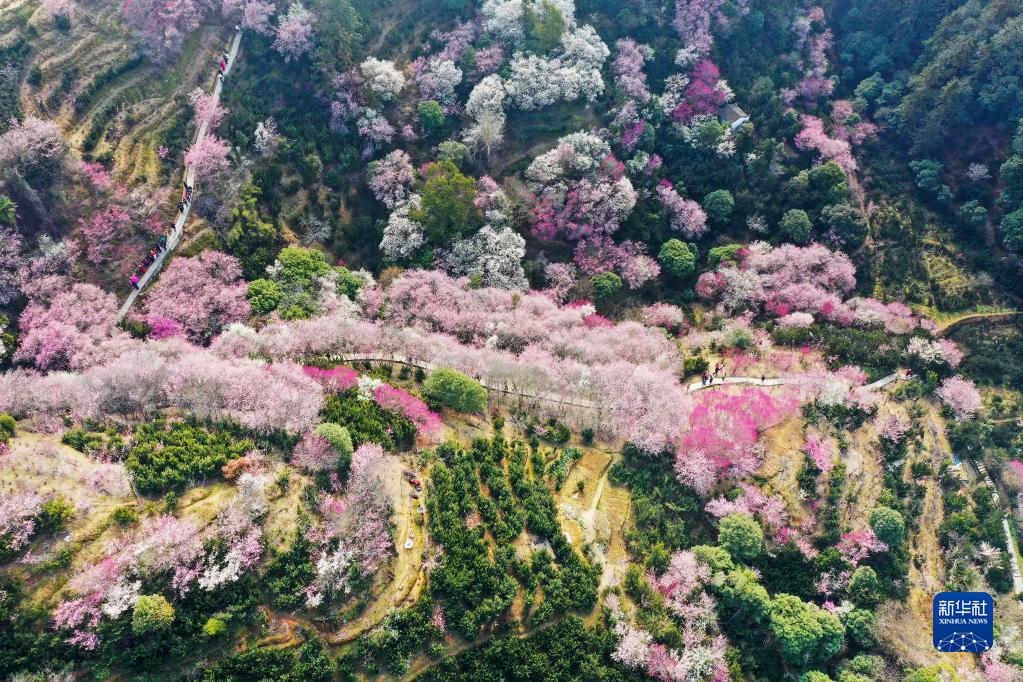 2月25日,游人在安徽省黃山市歙縣雄村鎮賣(mài)花漁村賞花(無(wú)人機照片)。