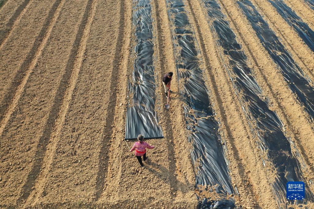 2月25日,農民在蒲廟鎮田園里鋪地膜(無(wú)人機照片)。