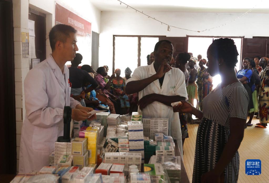 2月25日,在多哥卡拉市皮亞區醫療中心,中國第25批援多哥醫療隊醫生為當地病人發(fā)放藥品。