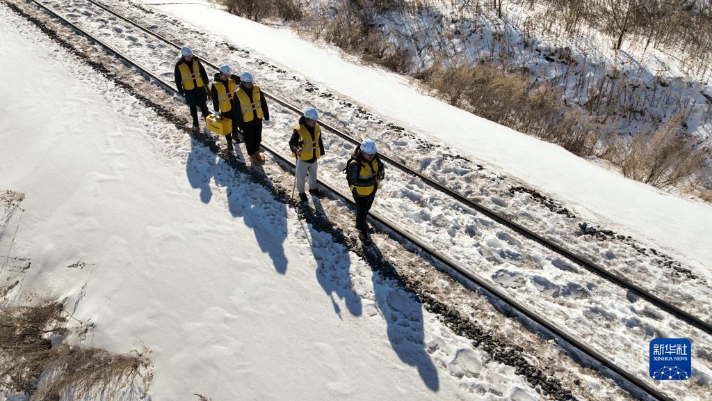 2月25日,黃騰(左一)與同事在佳撫鐵路佳富段進(jìn)行外業(yè)調查(無(wú)人機照片)。