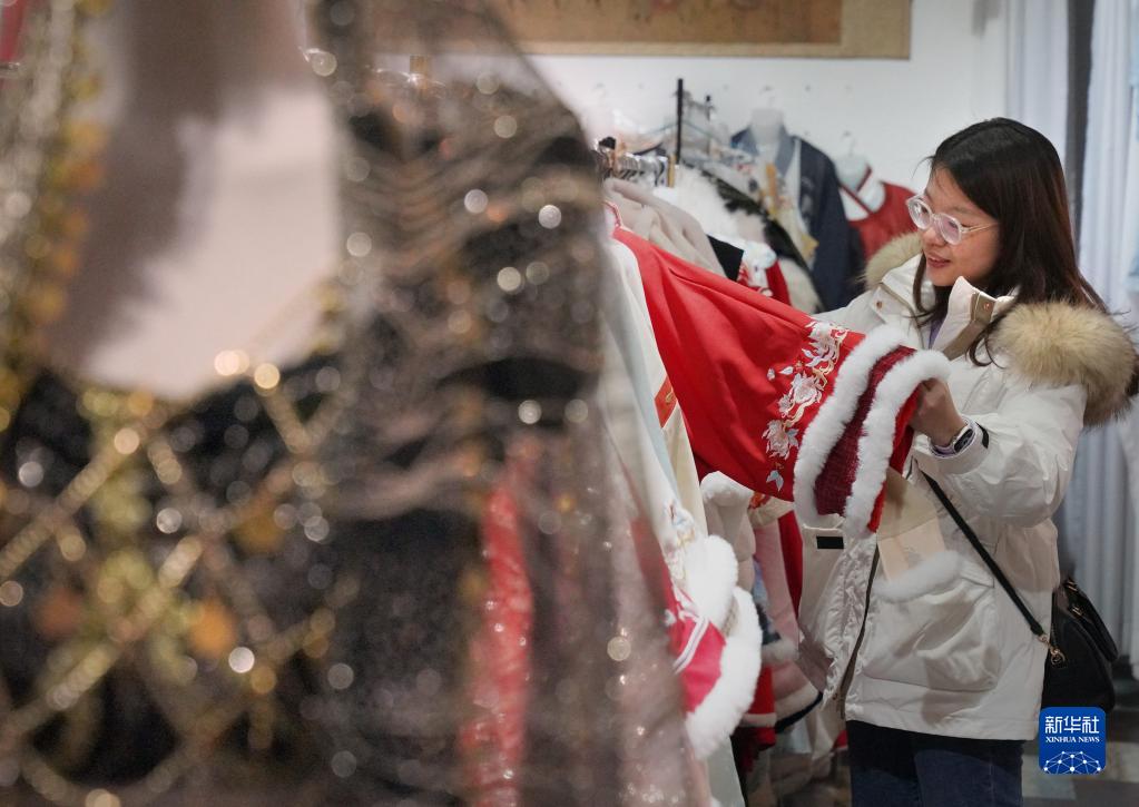 游客在洛陽(yáng)市洛邑古城的傳統服飾店內挑選服裝(2月22日攝)。