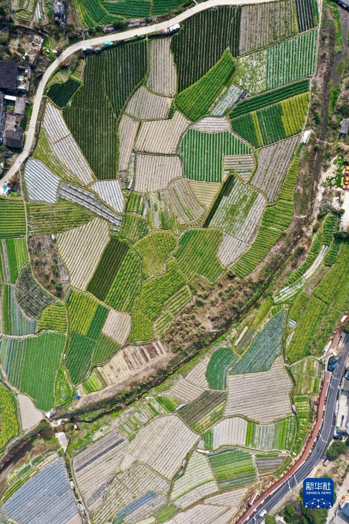 春耕時(shí)節,在福建省福州市鄉村山嶺間,一塊塊形狀各異、五彩斑斕的田地猶如大地上的拼圖,呈現別樣的春耕畫(huà)卷。