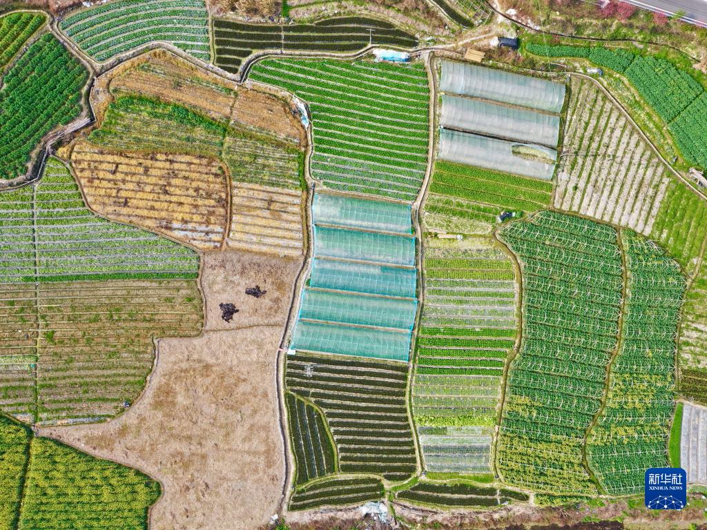 春耕時(shí)節,在福建省福州市鄉村山嶺間,一塊塊形狀各異、五彩斑斕的田地猶如大地上的拼圖,呈現別樣的春耕畫(huà)卷。