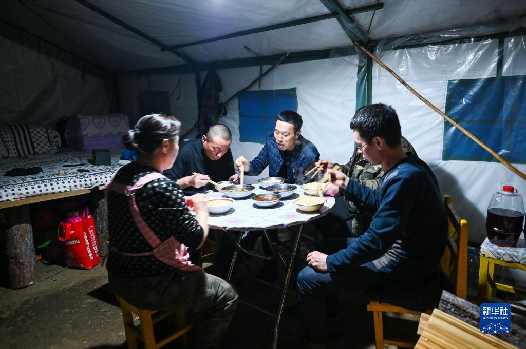 2月22日,烏龍岱林場(chǎng)402工隊職工在駐點(diǎn)的帳篷內吃晚飯。