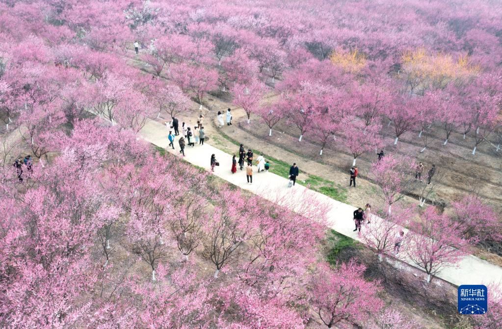 2月26日,游客在湖北省枝江市問(wèn)安鎮一處梅園踏春賞梅(無(wú)人機照片)。