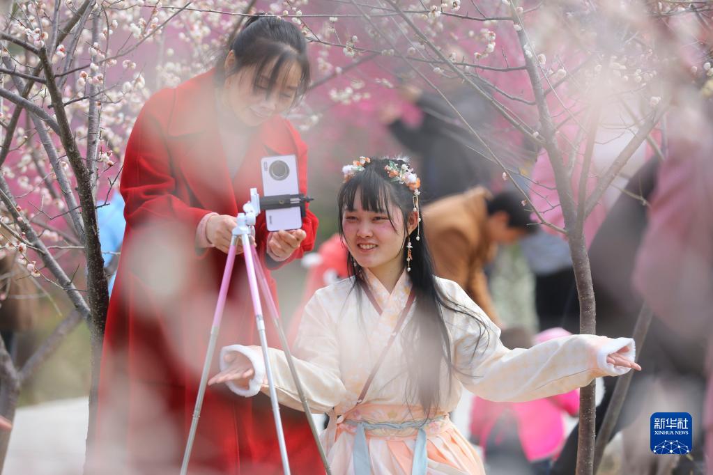 2月26日,人們在湖南省邵陽(yáng)市隆回縣七江鎮守拙園直播賞花。