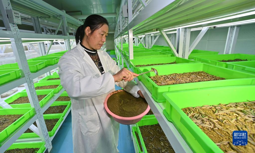 2月26日,貴州省鳳岡縣天敵昆蟲(chóng)繁育中心工作人員給躅蝽的食物粘蟲(chóng)投喂專(zhuān)用飼料。