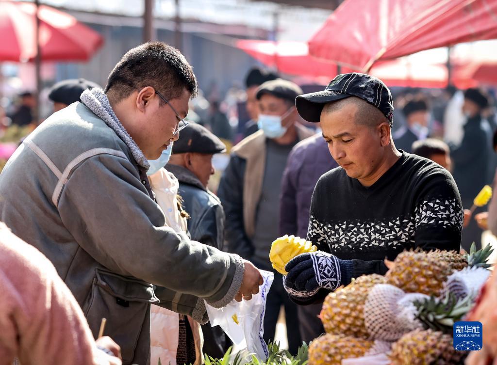 2月26日,在托克扎克鎮農貿市場(chǎng),顧客在購買(mǎi)菠蘿。