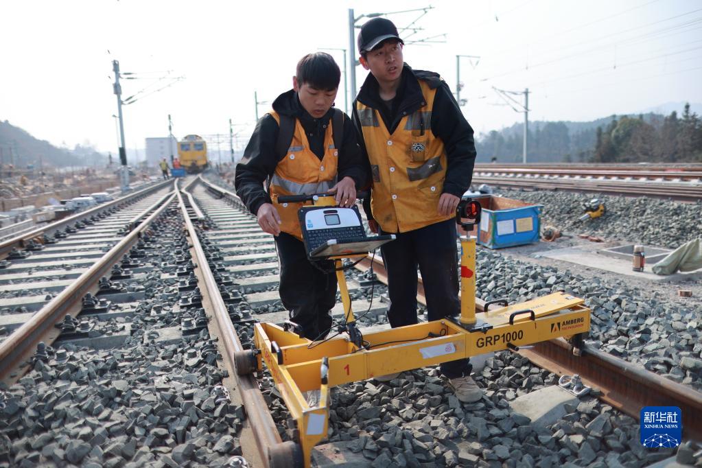 2月27日,在貴南高鐵都勻東站附近,貴陽(yáng)高鐵工務(wù)段的技術(shù)人員使用測量小車(chē)對鋼軌進(jìn)行檢測。