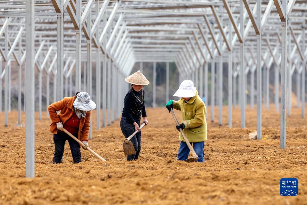 2月27日,村民在貴州省黔西市林泉鎮清塘村蔬菜種植基地平地起垅。