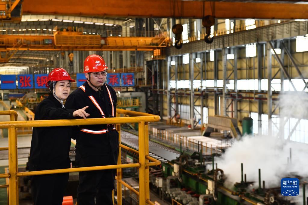 在山鋼集團日照公司生產(chǎn)車(chē)間,胡淑娥(左)了解鋼板生產(chǎn)情況(2月16日攝)。