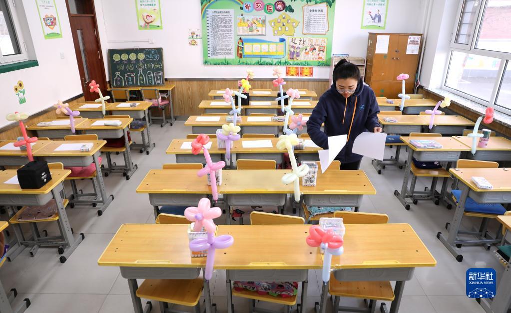 2月28日,遼寧省臺安縣逸夫小學(xué)教師尹岐在班級里為開(kāi)學(xué)第一課——心理課準備教具。