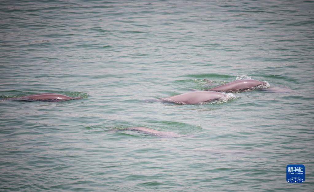 在湖北省宜昌市,長(cháng)江江豚在水中嬉戲(2021年5月11日攝)。