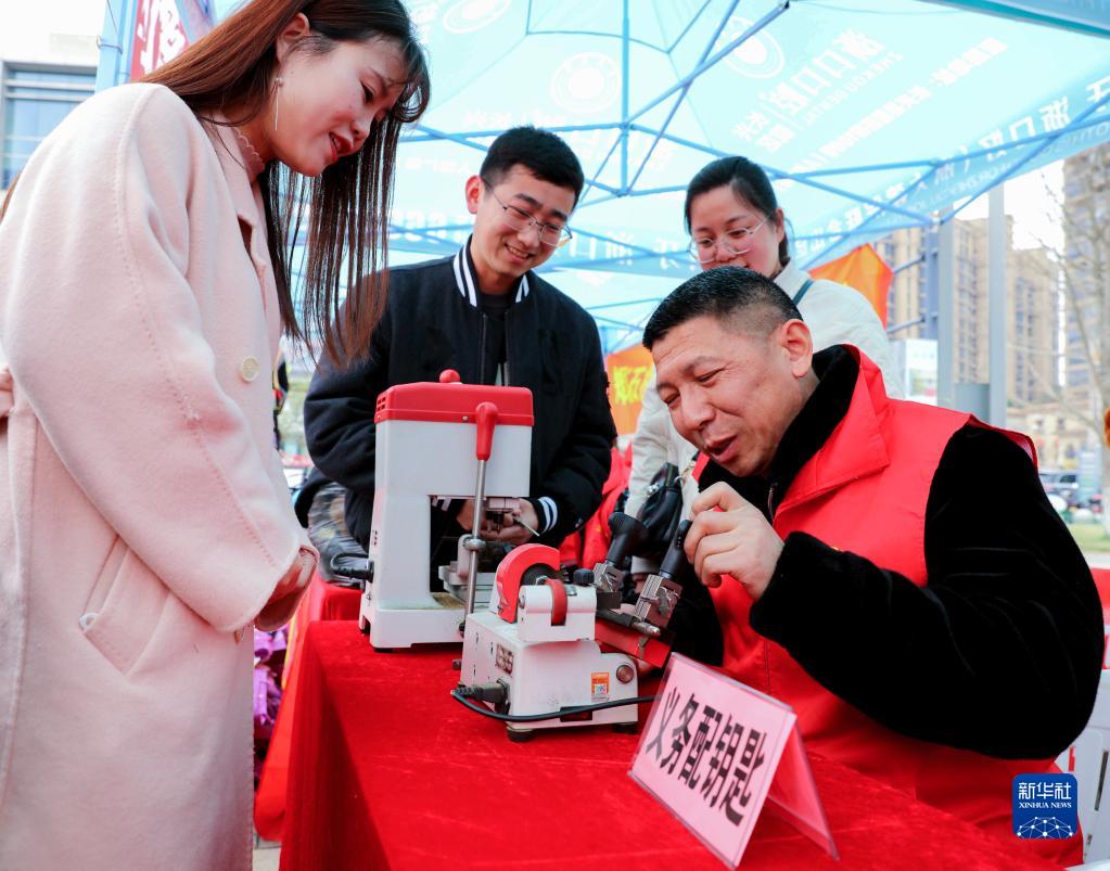 2月28日,在長(cháng)興縣和文化廣場(chǎng)上,雉城街道社工志愿者給市民免費配鑰匙。
