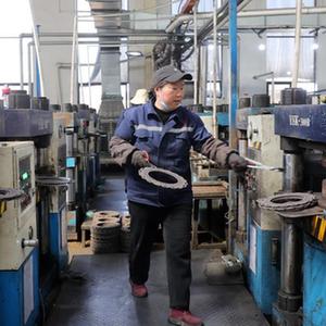 2月28日,在淮北市濉溪經(jīng)濟開(kāi)發(fā)區一家制動(dòng)部件生產(chǎn)企業(yè),工人在車(chē)間生產(chǎn)剎車(chē)盤(pán)。