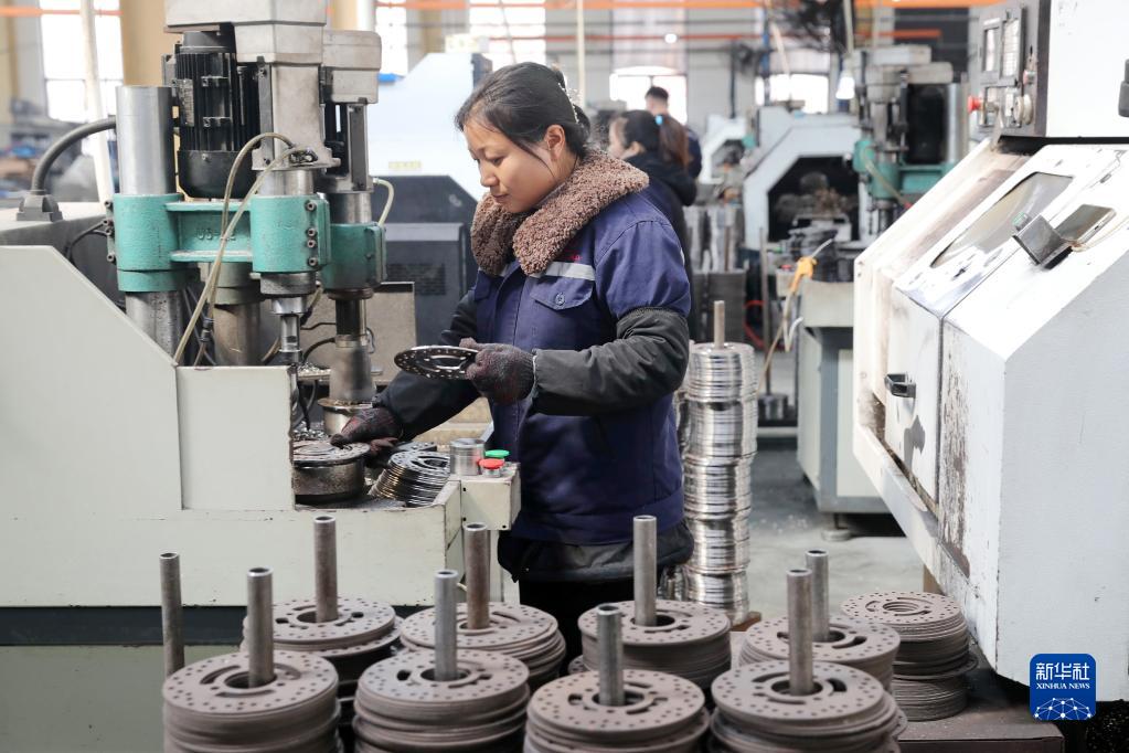2月28日,在淮北市濉溪經(jīng)濟開(kāi)發(fā)區一家制動(dòng)部件生產(chǎn)企業(yè),工人在車(chē)間生產(chǎn)剎車(chē)盤(pán)。