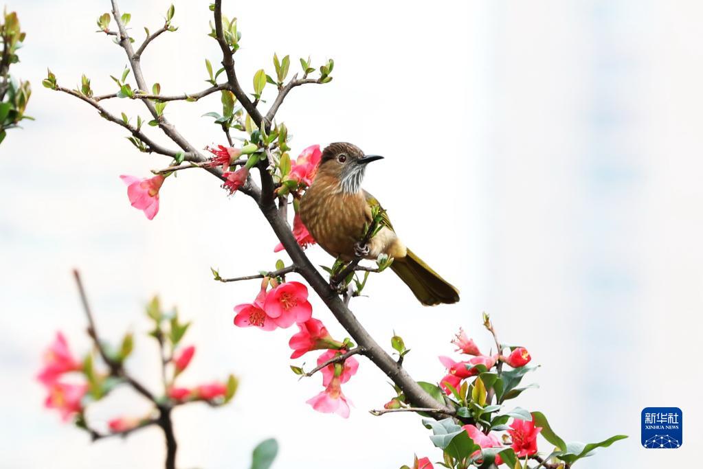 2月27日,在四川省達州市通川區大寨子公園,一只綠翅短腳鵯在花枝上停歇。