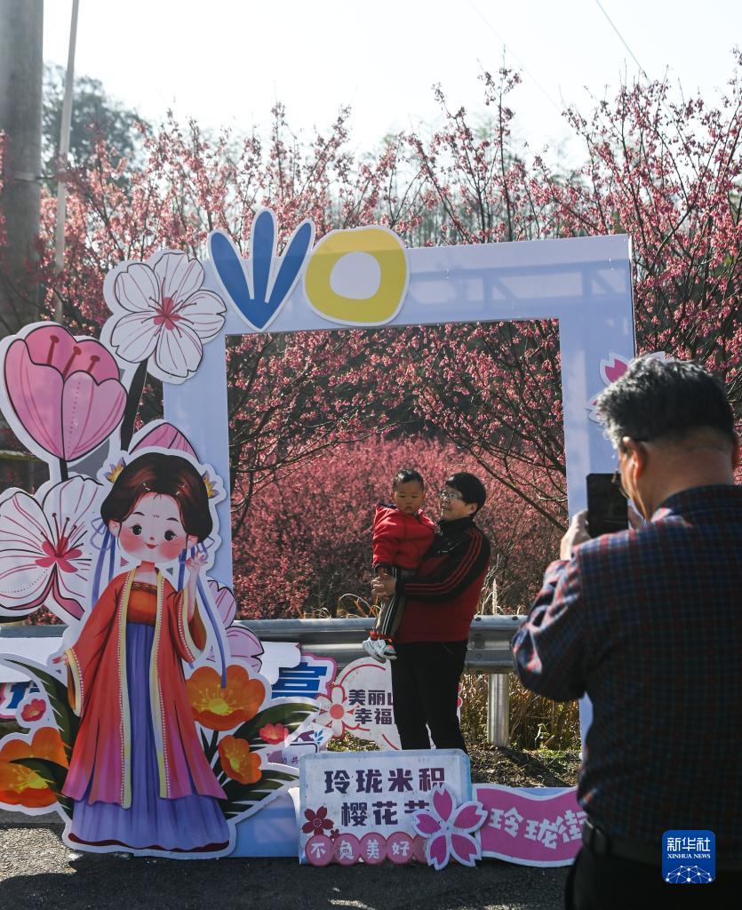 2月28日,游客在杭州市臨安區玲瓏街道米積村的櫻花林里拍照留影。