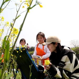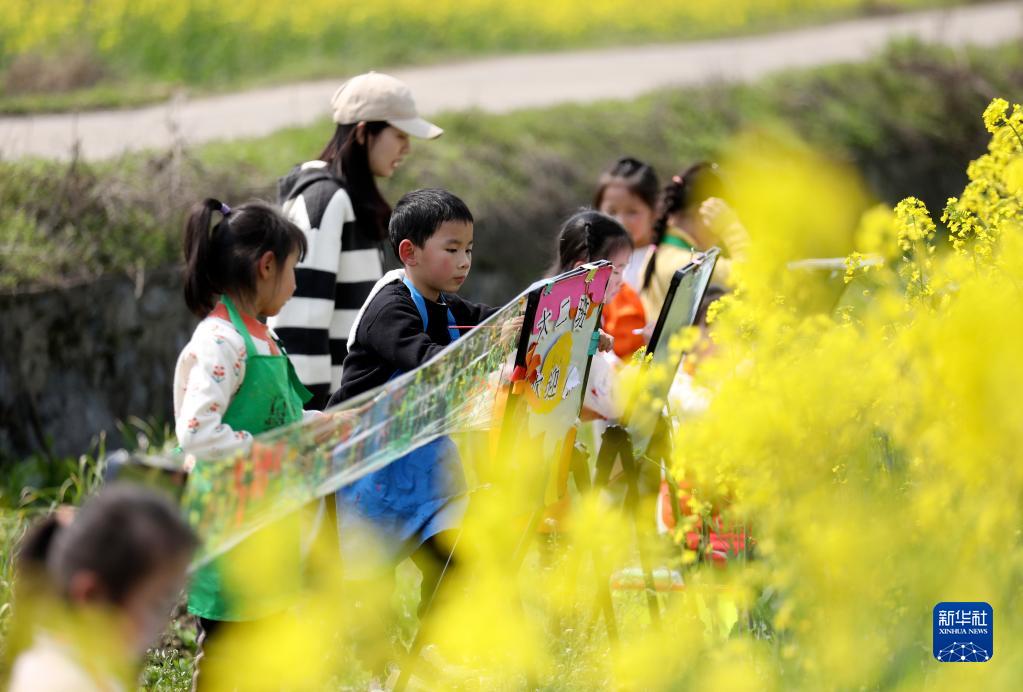 2月28日,在湖南省資興市唐洞街道高碼村,小朋友在油菜花田旁畫(huà)畫(huà)。