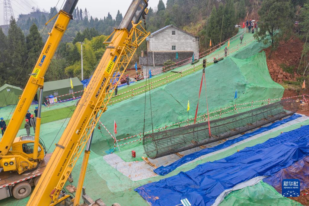 3月1日,在重慶市潼南區小渡鎮川渝1000千伏特高壓交流工程(重慶段)施工現場(chǎng),工作人員操作吊車(chē)起吊鋼筋籠。