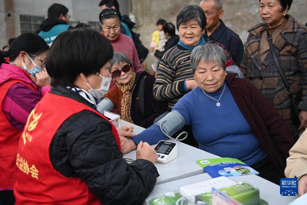 3月1日,志愿者在寧波市奉化區錦屏街道城西岙村為村民測量血壓。