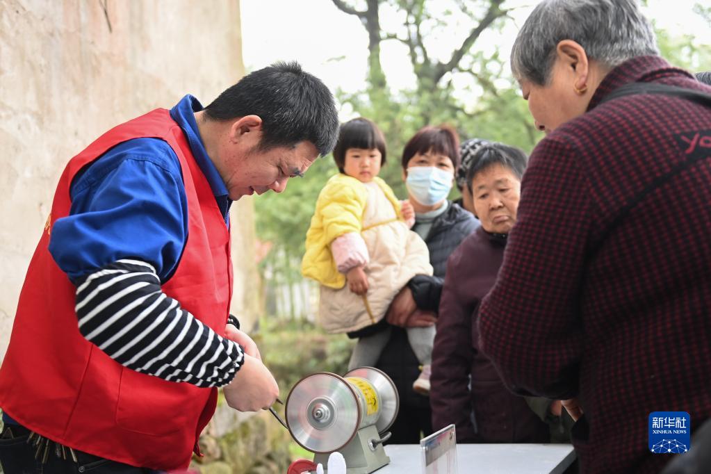 3月1日,志愿者在寧波市奉化區錦屏街道城西岙村免費為村民磨刀。