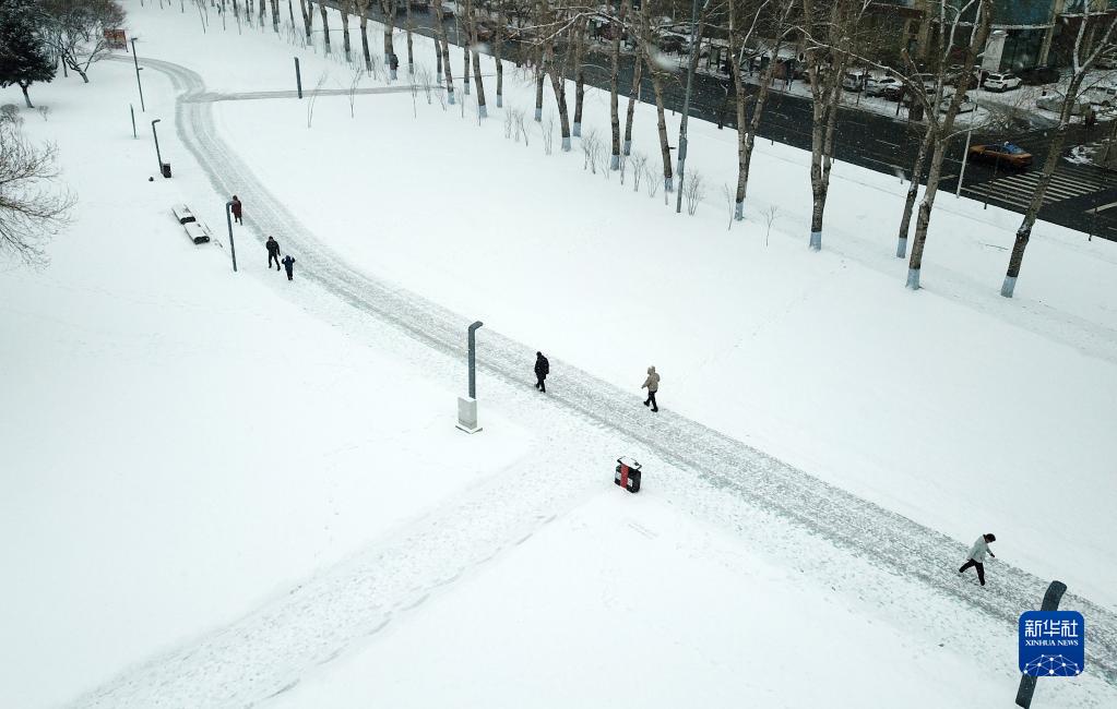 3月1日,在哈爾濱市湘江公園,市民在雪中散步(無(wú)人機照片)。