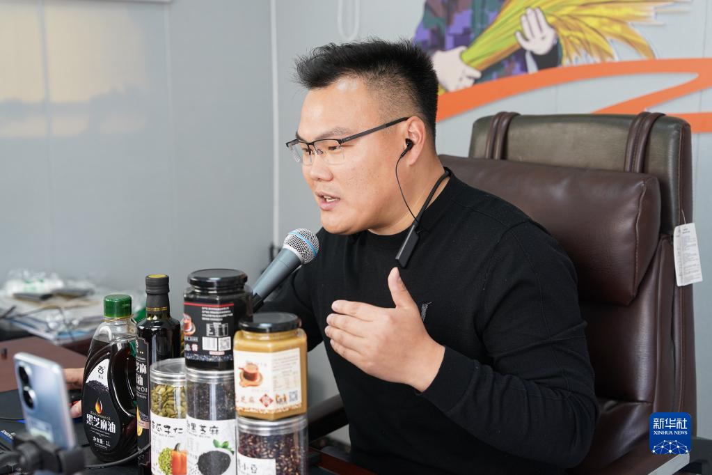 2月28日,王昌在來(lái)安縣水口鎮擁巷村的直播間里直播推介鄉村農產(chǎn)品。