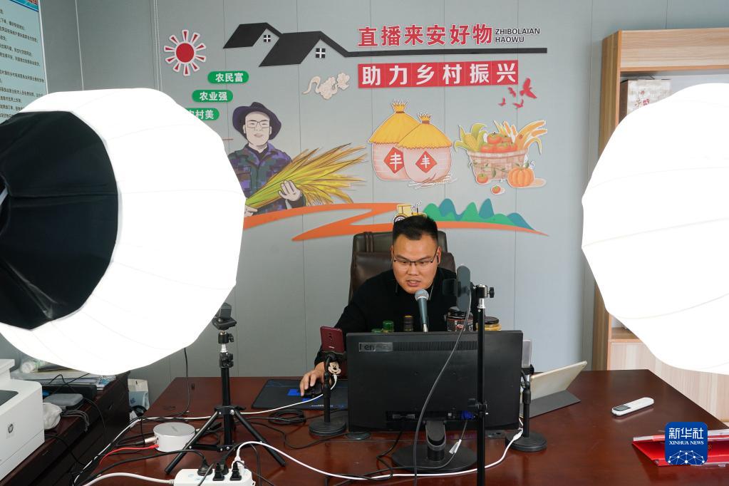 2月28日,王昌在來(lái)安縣水口鎮擁巷村的直播間里直播推介鄉村農產(chǎn)品。