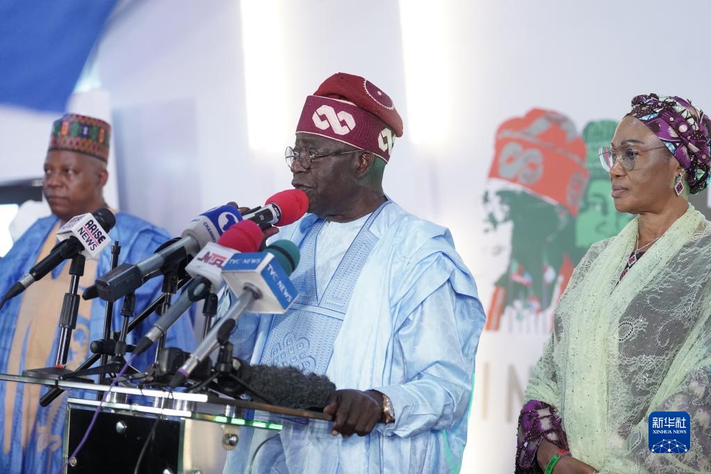3月1日,在尼日利亞首都阿布賈,尼日利亞當選總統博拉·蒂努布(中)發(fā)表勝選講話(huà)。