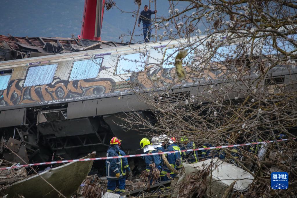 3月1日,消防人員在希臘中部城市拉里薩市附近的火車(chē)相撞事故現場(chǎng)參與救援。