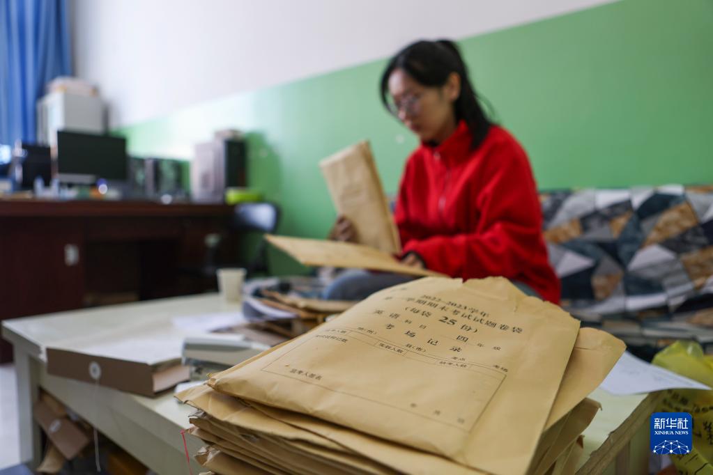 3月1日,和田縣塔瓦庫勒鄉巴克墩村小學(xué)一名老師在整理試卷。