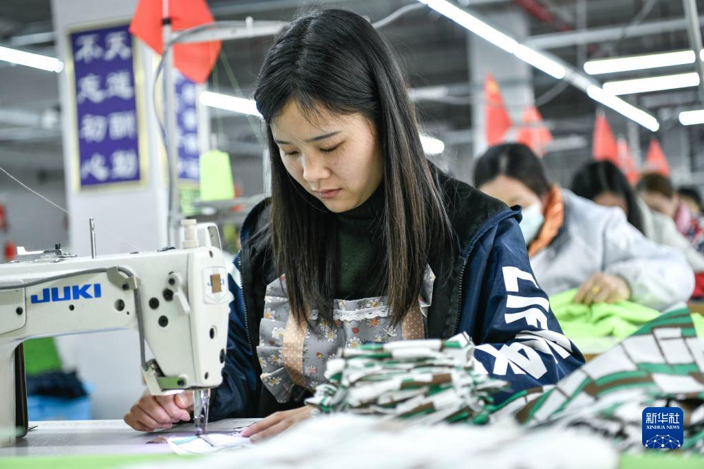 工人在貴州省天柱工業(yè)園區一家服飾公司縫制服裝(2月28日攝)。