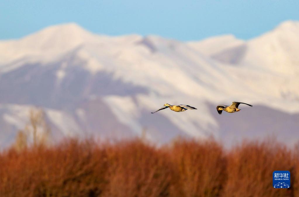 在拉薩市林周縣,斑頭雁在雪山前飛翔(3月1日攝)。