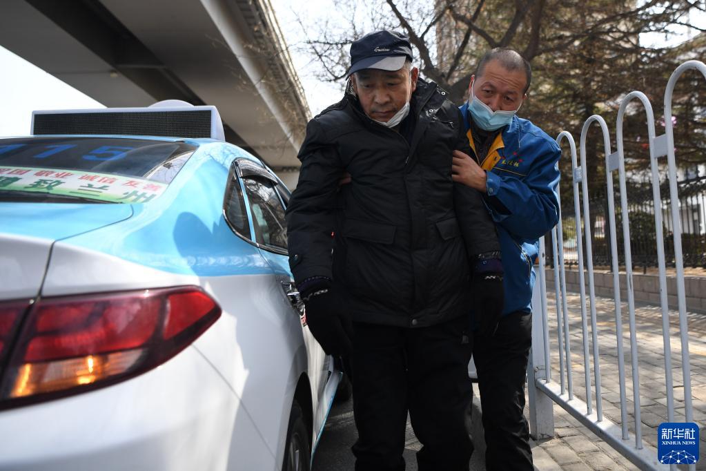 強漢紅攙扶行動(dòng)不便的老人下車(chē)準備就醫(3月1日攝)。