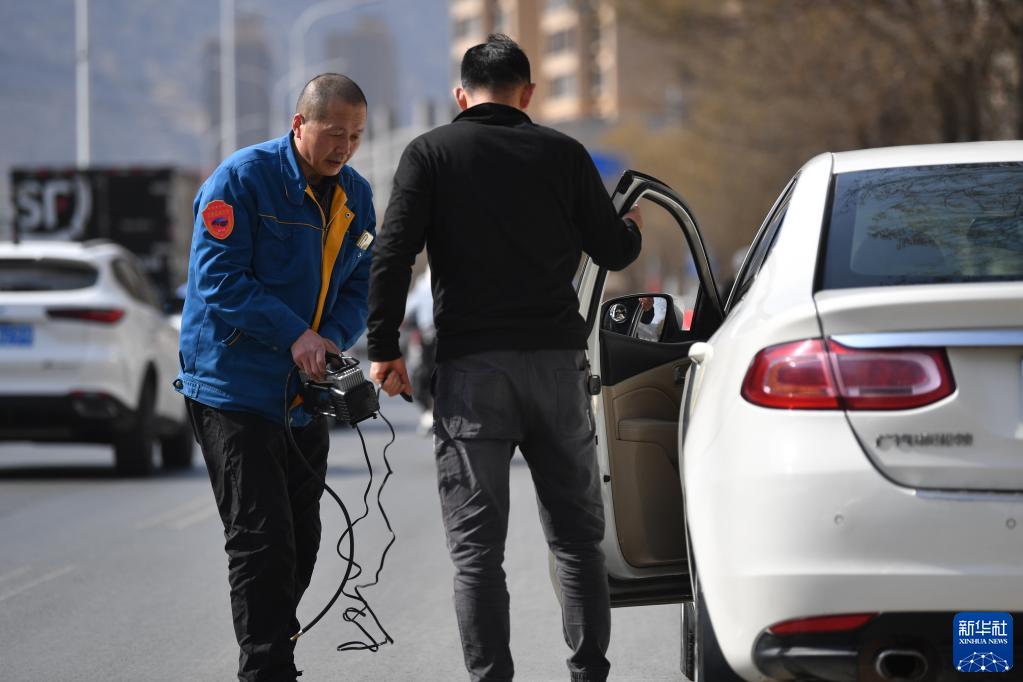 強漢紅在路上幫助一名車(chē)主檢查解決車(chē)輛輪胎故障(3月1日攝)。