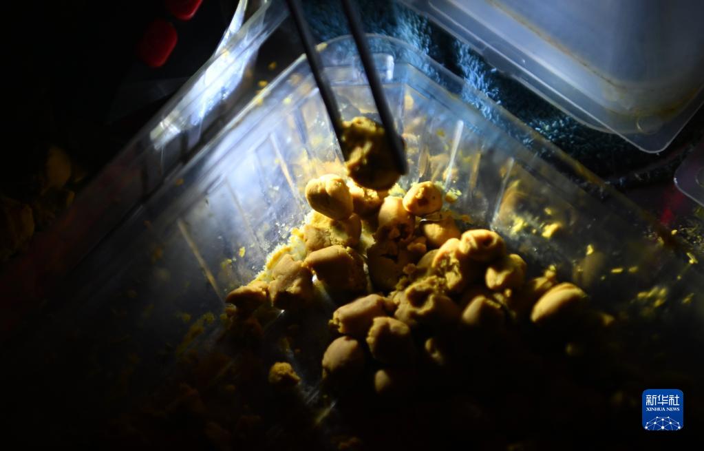 工作人員在中農熊蜂繁育基地繁育車(chē)間內夾取蜂糧(3月1日攝)。