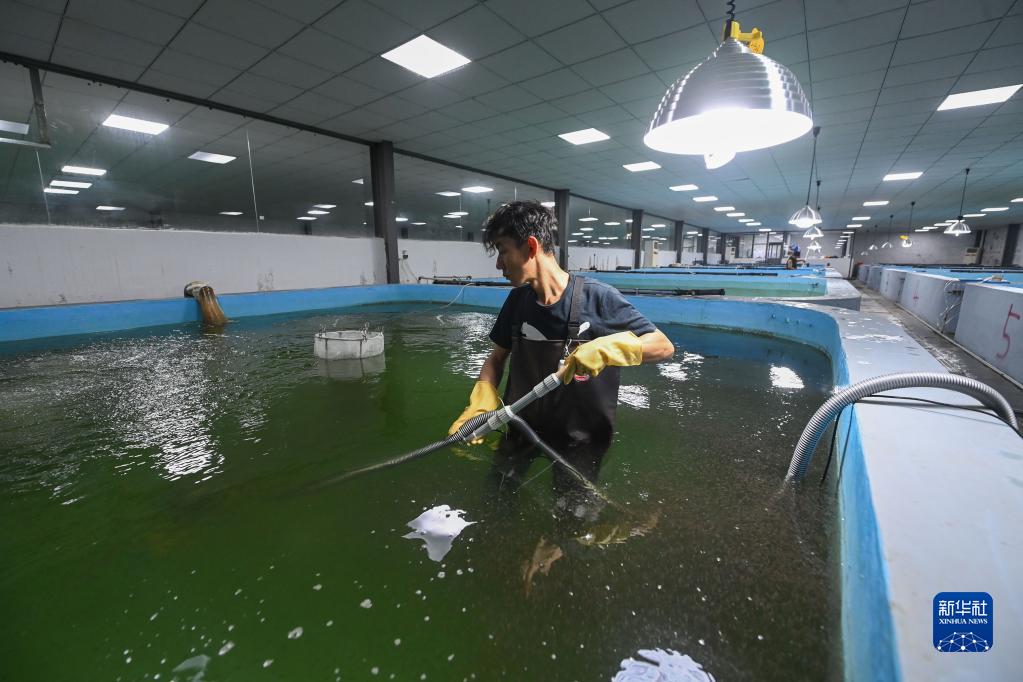 3月2日,在位于湖州市吳興區東林鎮保健村的湖旺水產(chǎn)基地的恒溫繁育車(chē)間內,工作人員在進(jìn)行人工吸污并查看水池中鱸魚(yú)魚(yú)苗的生長(cháng)情況。該水產(chǎn)基地460畝育苗池塘配套著(zhù)恒溫設備,數字化繁育車(chē)間每日能孵化出2000萬(wàn)尾魚(yú)苗,供給周邊的漁業(yè)養殖戶(hù)。