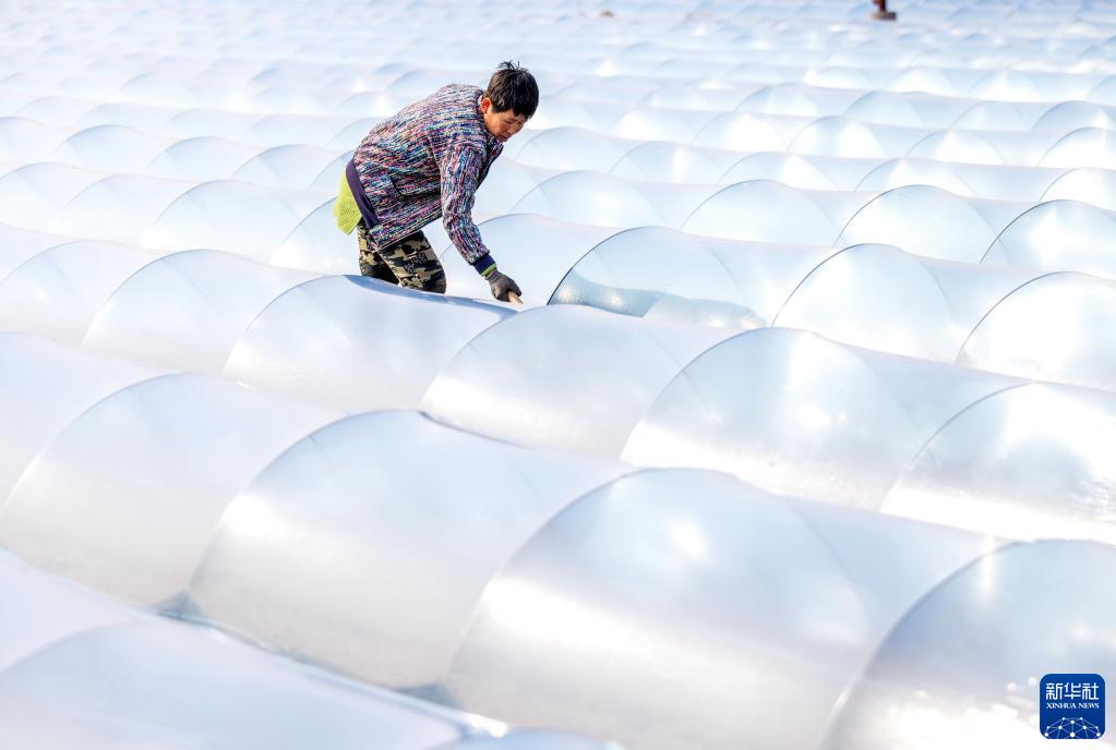 3月2日,唐山市豐南區岔河鎮三神莊村的農民在田間給馬鈴薯棚膜覆土。