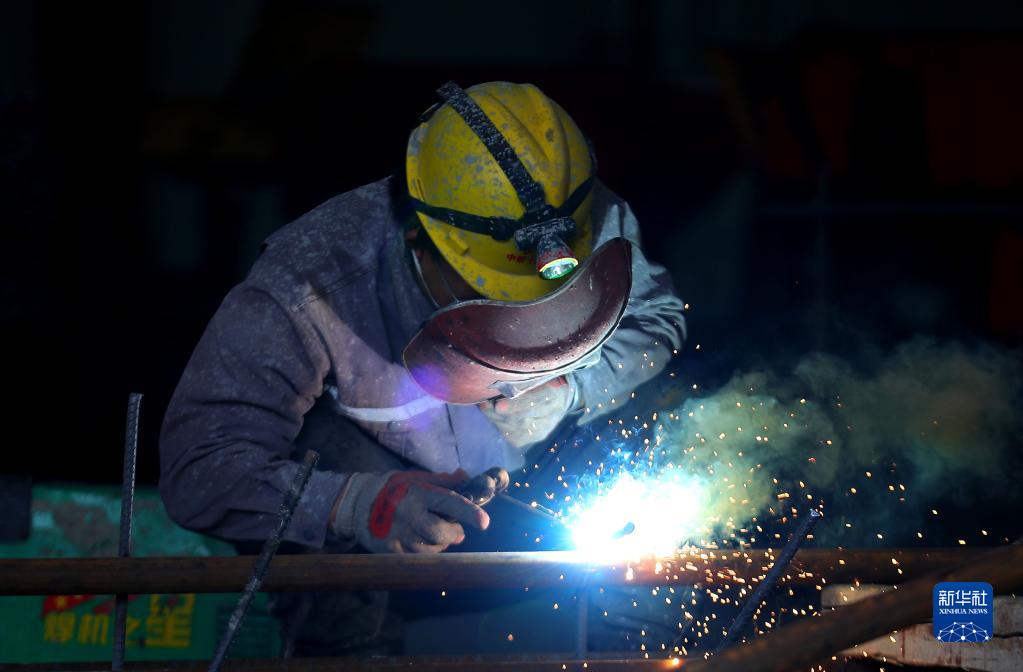 3月1日,在沈白高鐵遼寧段一處鋼筋加工廠(chǎng),中鐵十九局施工人員進(jìn)行焊接作業(yè)。