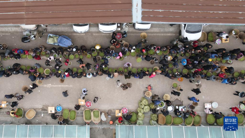 3月2日,在雅安市名山區雙河鮮葉交易市場(chǎng)內,茶農與茶企在進(jìn)行茶葉交易(無(wú)人機照片)。