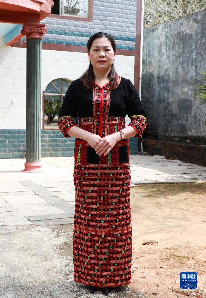 韋小麗身著(zhù)黎族服飾在海南省白沙黎族自治縣七坊鎮長(cháng)龍村(2月23日攝)。