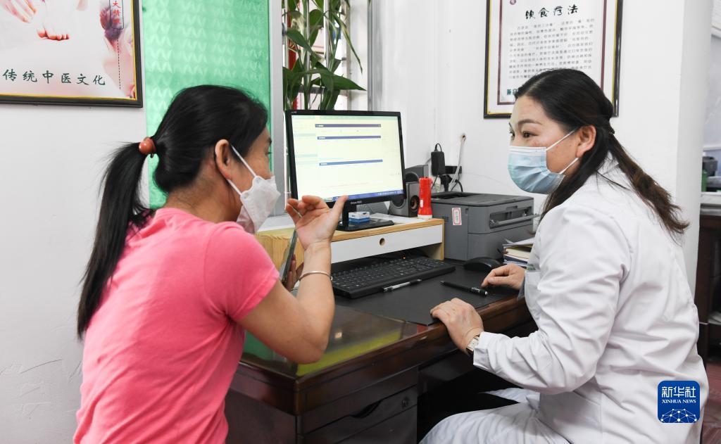在海南省白沙黎族自治縣七坊鎮社區醫院,韋小麗(右)在為病人問(wèn)診(2月13日攝)。