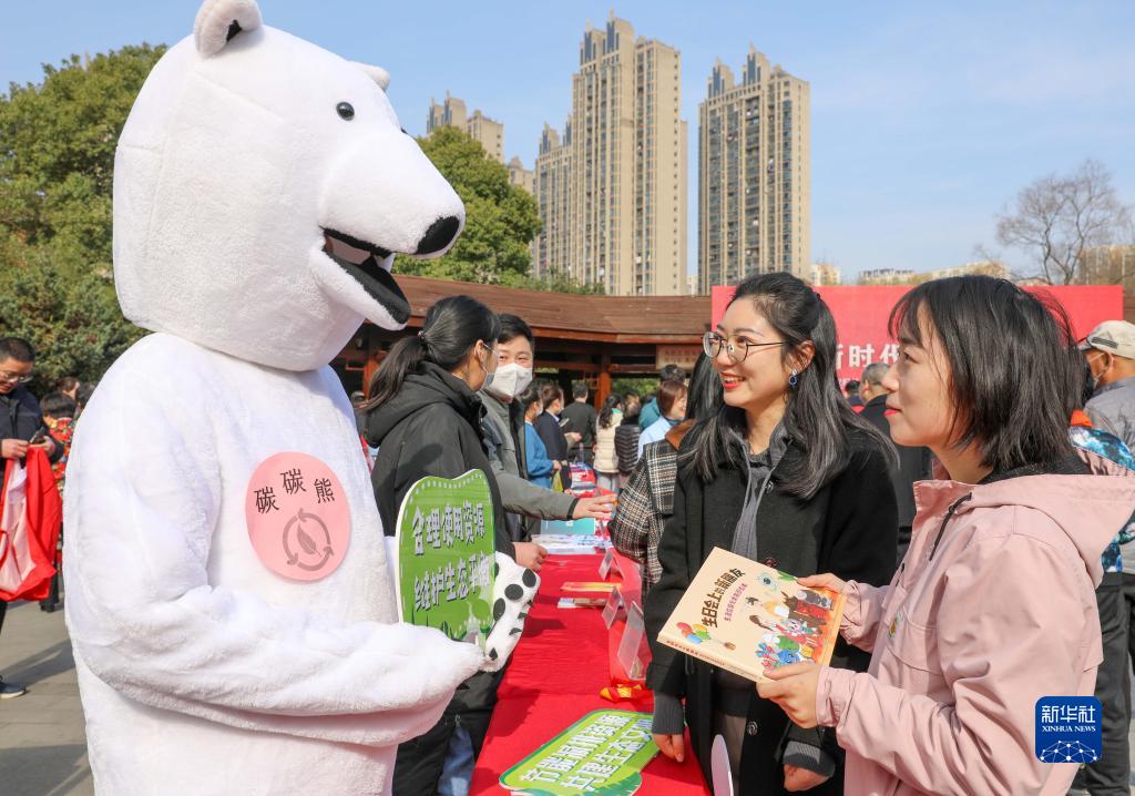 3月3日,穿著(zhù)卡通服裝的合肥市包河區濱湖世紀社區志愿者向居民講解環(huán)保知識。